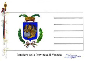 GONFALONE: Drappo di rosso con la bordatura dello stesso, bordata da filetti d’oro interni ed esterni incrociantisi negli angoli, e caricata da ricami d’oro e da quattro sfere armillari, d’azzurro e d’oro, una in capo, una in punta, due nei fianchi; il drappo sarà caricato dallo stemma della città con la iscrizione centrata in oro: CITTÀ DI VENEZIA. Il drappo sarà ornato nella parte inferiore da sei strisce rettangolari di rosso, orlate da filetti d’oro, caricate da ricami dello stesso, alte circa un terzo dell’intero drappo. Le parti di metallo ed i cordoni saranno dorati. L’asta verticale sarà ricoperta di velluto rosso, con bullette dorate poste a spirale. Nella freccia sarà rappresentato lo stemma della Città e sul gambo inciso il nome. Cravatta con nastri tricolorati dai colori nazionali frangiati d’oro.