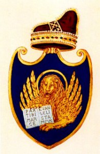 STEMMA: D’azzurro, al leone d’oro, alato e nimbato dello stesso, con la testa posta di fronte, accovacciato, tenente fra le zampe anteriori avanti al petto il libro d’argento, aperto, scritto delle parole a lettere maiuscole romane di nero PAX TIBI MARCE, nella prima facciata in quattro righe, ed EVANGELISTA MEUS nella seconda facciata, similmente in quattro righe. Lo scudo di forma veneta sarà timbrato dal corno dogale.